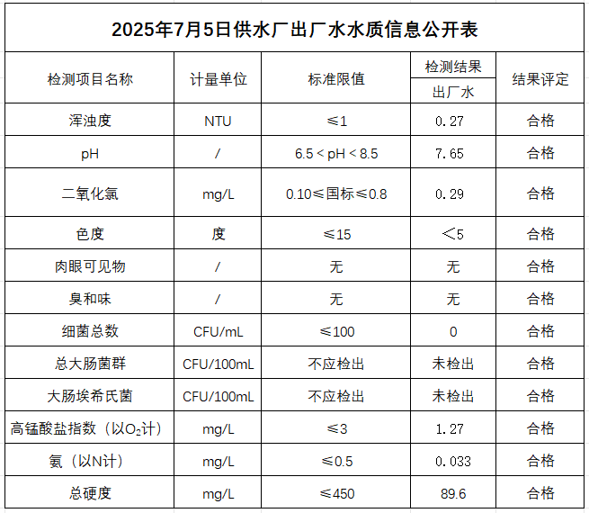 2025年7月5日供水厂出厂水水质信息公开表