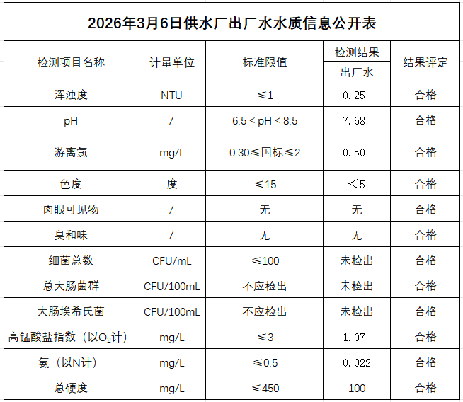 2026年3月6日供水厂出厂水水质信息公开表